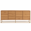 Gefertigt aus 18 mm MDF mit Eichenfurnier, vereint er eine warme Holzoptik mit eingeschnitzten Türen, die für ein dekoratives und lebendiges Erscheinungsbild sorgen. Die schlanken Metallbeine heben den Schrank elegant vom Boden ab und verleihen ihm einen modernen Akzent, der das natürliche Holz wunderschön ergänzt.